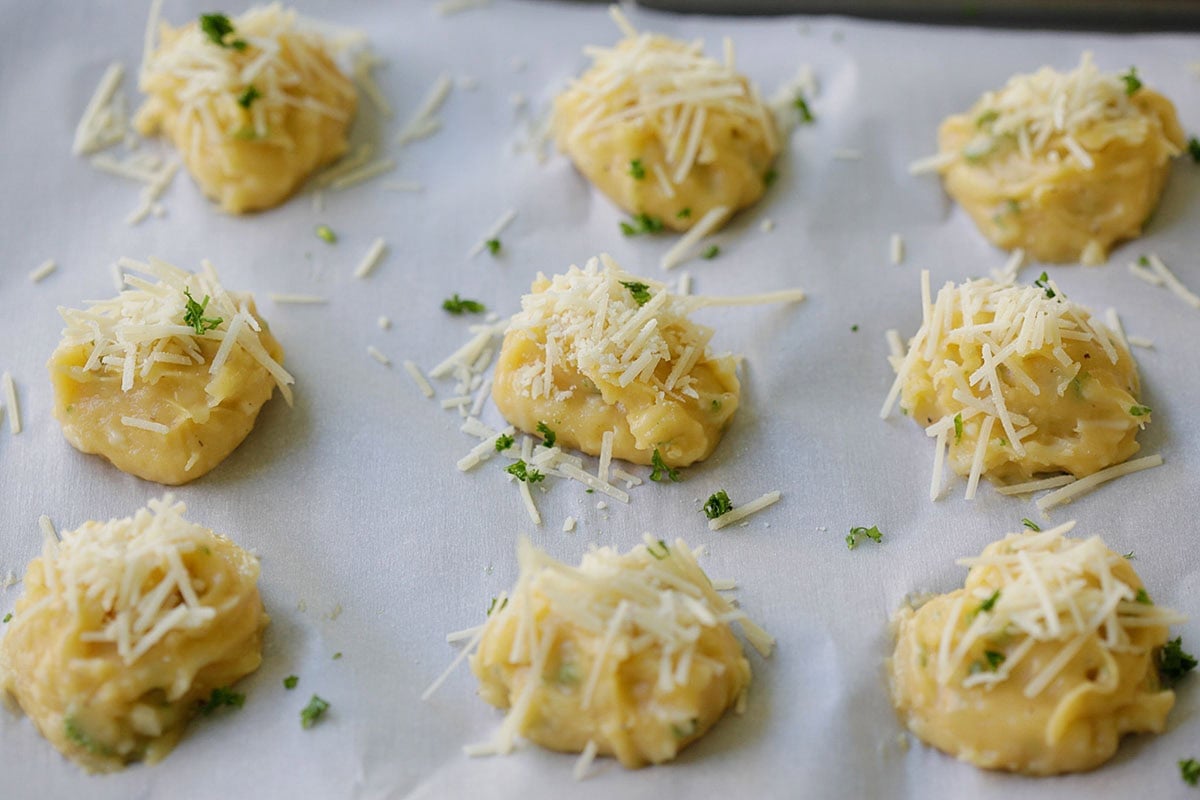 • Add the mozzarella cheese and parsley, and mix well. Using 2 tablespoons, shape each ball of dough and drop it onto the prepared parchment paper, spacing them 1.5 to 2 inches (4 to 5 cm) apart. Sprinkle some grated Parmesan cheese on top.